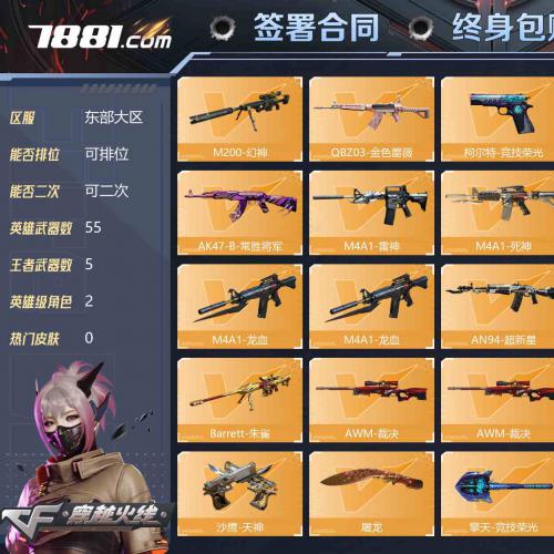 【可二次 英雄武器数量:55 英雄角色数量:2 王者武器数量:5 AK47-火麒麟音效卡,M4A1-黑骑士音效卡 稀有武器:11个 】【商品标题】:【幻神1皮】【毒蜂】【斯泰尔-蝴蝶】【M200-幻神】【幻神-宠儿-2021MVP】【AWM-裁决】【QBZ03-金色蔷薇】【柯尔特-竞技荣光】【COP 357-幻灵】【加特林-炼狱】【炼狱-悦蓝-觉醒版】【汤姆逊-烈龙】【斯泰尔-蝴蝶】【毒蜂】【电竞教官-云悠悠】【瞳】【修道士】【M4A1-雷神】【雷神-宠儿-2019MVP】【雷神-赛博朋克】【雷神-烈虎皮肤】【雷神-虎将】
